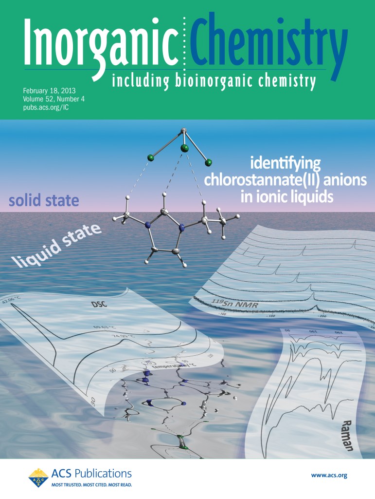- M. Currie, J. Estager, P. Licence, S. Men, P. Nockemann, K.R. Seddon, M. Swadźba-Kwaśny* and C. Terrade, Chlorostannate(II) ionic liquids – speciation, Lewis acidity and oxidative stability, Inorg. Chem., 2013, 52, 1710. (cover)