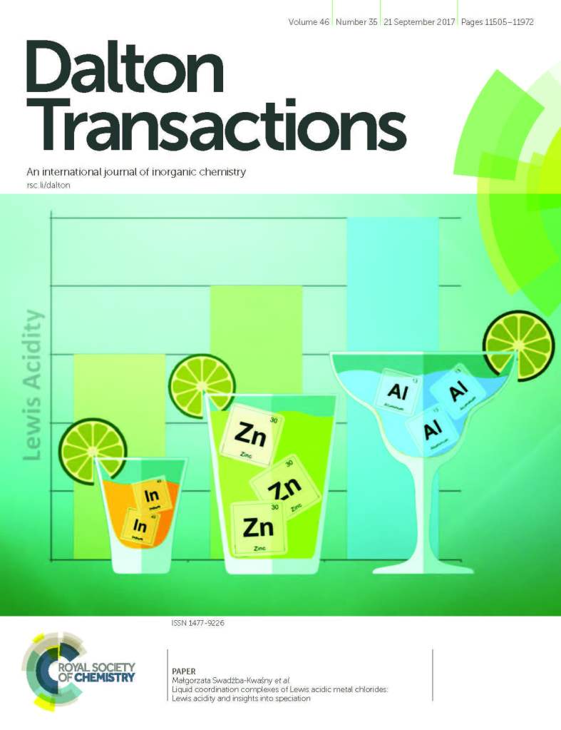 - J.M. Hogg, L.C. Brown, K. Matuszek, P. Latos, A. Chrobok and M. Swadźba-Kwaśny,* Liquid coordination complexes of Lewis acidic metal chlorides: Lewis acidity and insights into speciation, Dalton Trans., 2017, 46, 11561. cover