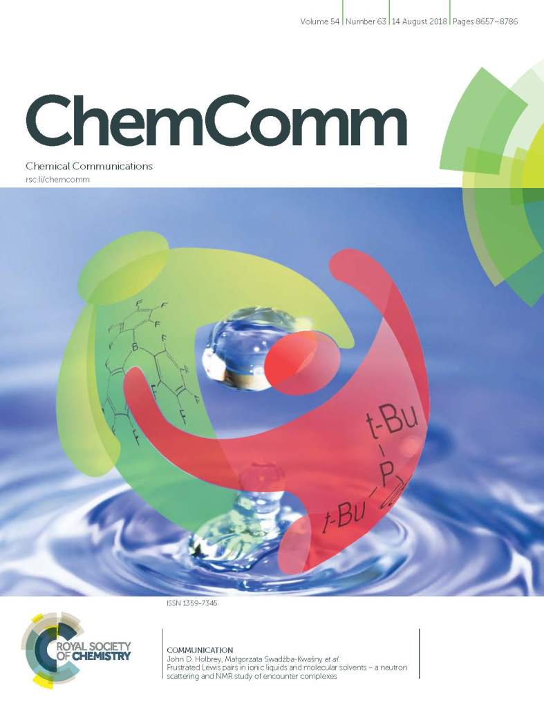 - L. C. Brown, J. M. Hogg, M. Gilmore, L. Moura, S. Imberti, S. Gaertner, H. Q. Nimal Gunaratne, R. J. O’Donnell, N. Artioli, J. D. Holbrey* and M. Swadźba-Kwaśny,* Frustrated Lewis Pairs in Ionic Liquids and Molecular Solvents – A Neutron Scattering and NMR Study of Encounter Complexes, Chem. Commun., 2018, 54, 8689. invited, cover